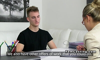 Female agent in stockings gives footjob