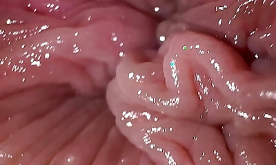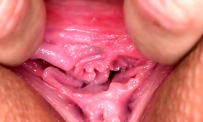 Erotic nympho is widely opened narrowed slit in close up and having orgasm