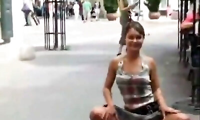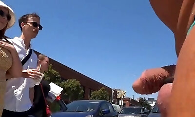 Extreme Public Exhibitionist Handjob, Clothed People Walking By With Miss Cream-colored