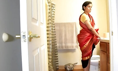 Maid in saree outdoors, public peeing, fingering
