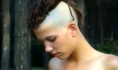 Thin and tall punk girl with two horny men in the forest